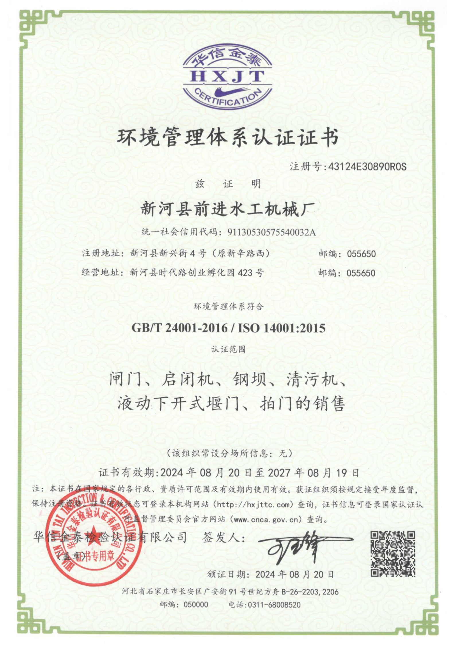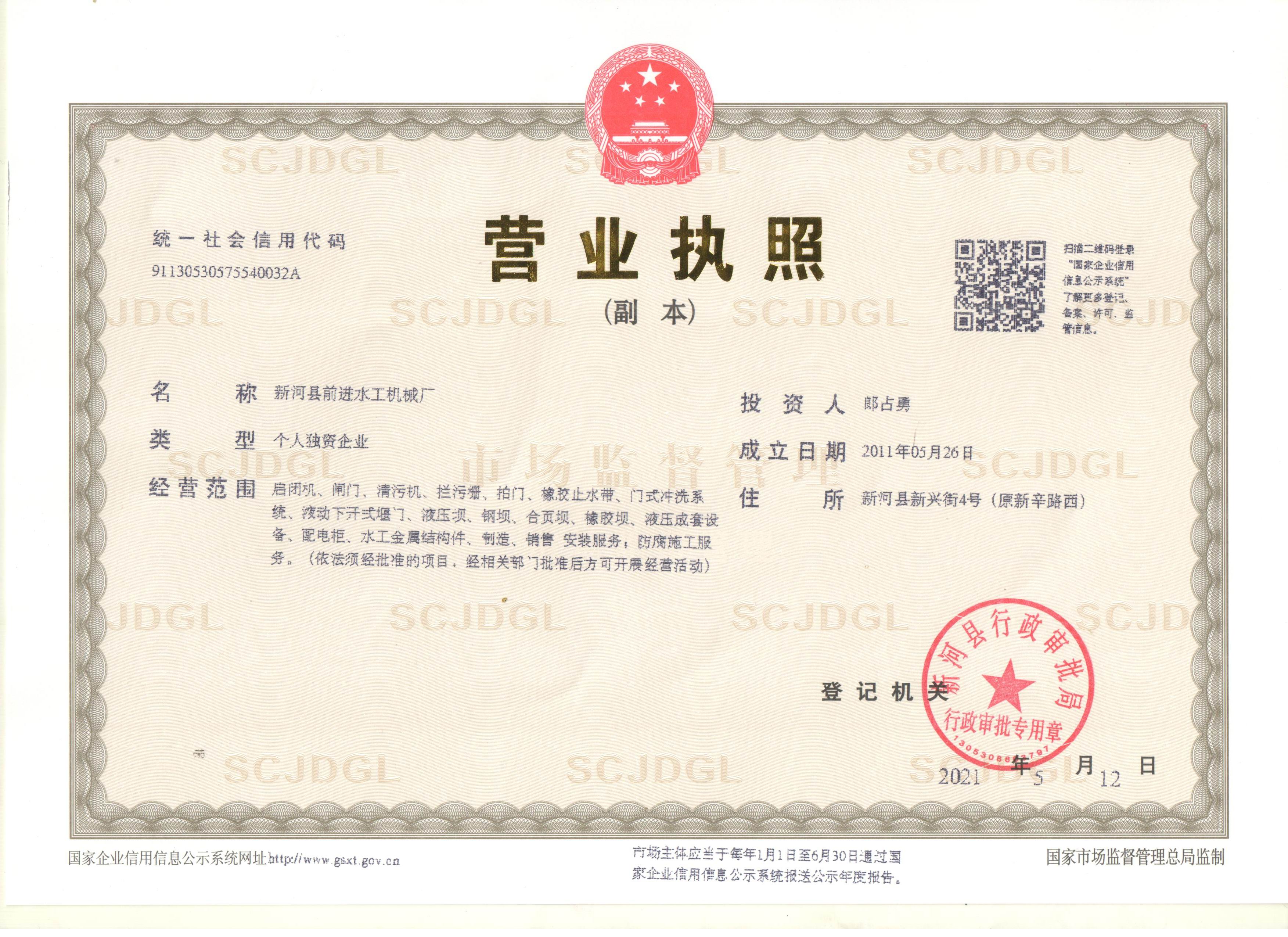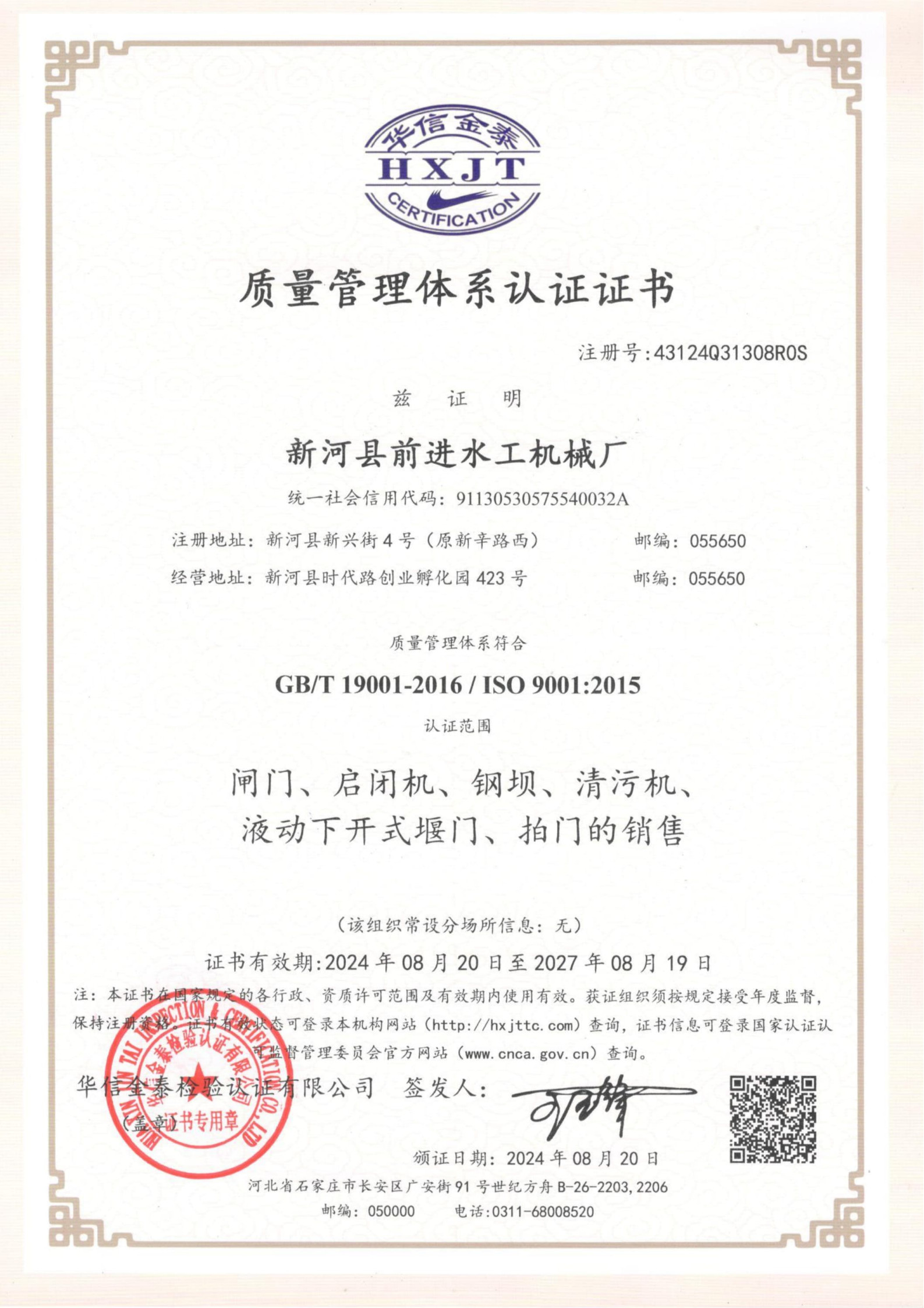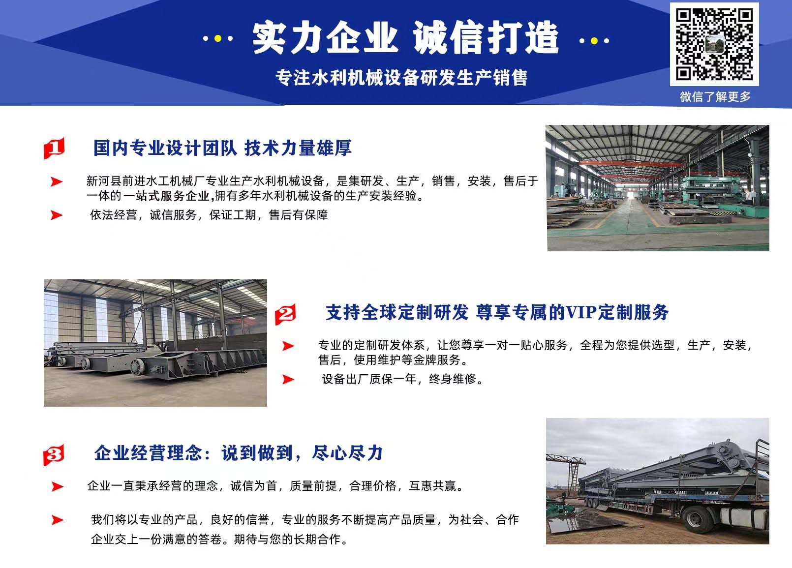 新河縣前進(jìn)水工機(jī)械廠是一家專門從事水利工程設(shè)備研發(fā)生產(chǎn)的廠家,現(xiàn)有員工228人,各類高、中級(jí)專業(yè)工程技術(shù)人員近30人,技術(shù)生產(chǎn)工人180多人。公司占地面積14674平方米。公司擁有車、鉗、刨、銑、冷作、鈑金、鑄造等,工種齊全,加工能力和技術(shù)力量雄厚,并具備理化測試手段與儀器設(shè)備。前進(jìn)水工專注景觀閘門,鋼壩,合頁壩,液壓升降壩,液壓閘門,臥倒門,一字門,人字門,液壓啟閉機(jī),卷揚(yáng)啟閉機(jī),螺桿啟閉機(jī),清污機(jī),除污機(jī),閘門,拍門等設(shè)備的研發(fā)與生產(chǎn),是新河水利工程產(chǎn)品行業(yè)的領(lǐng)跑者,不僅在同行業(yè)群中揭起了一次又一次的技術(shù)革新,更為水利工程企業(yè)提供了更高更大的選擇平臺(tái)。